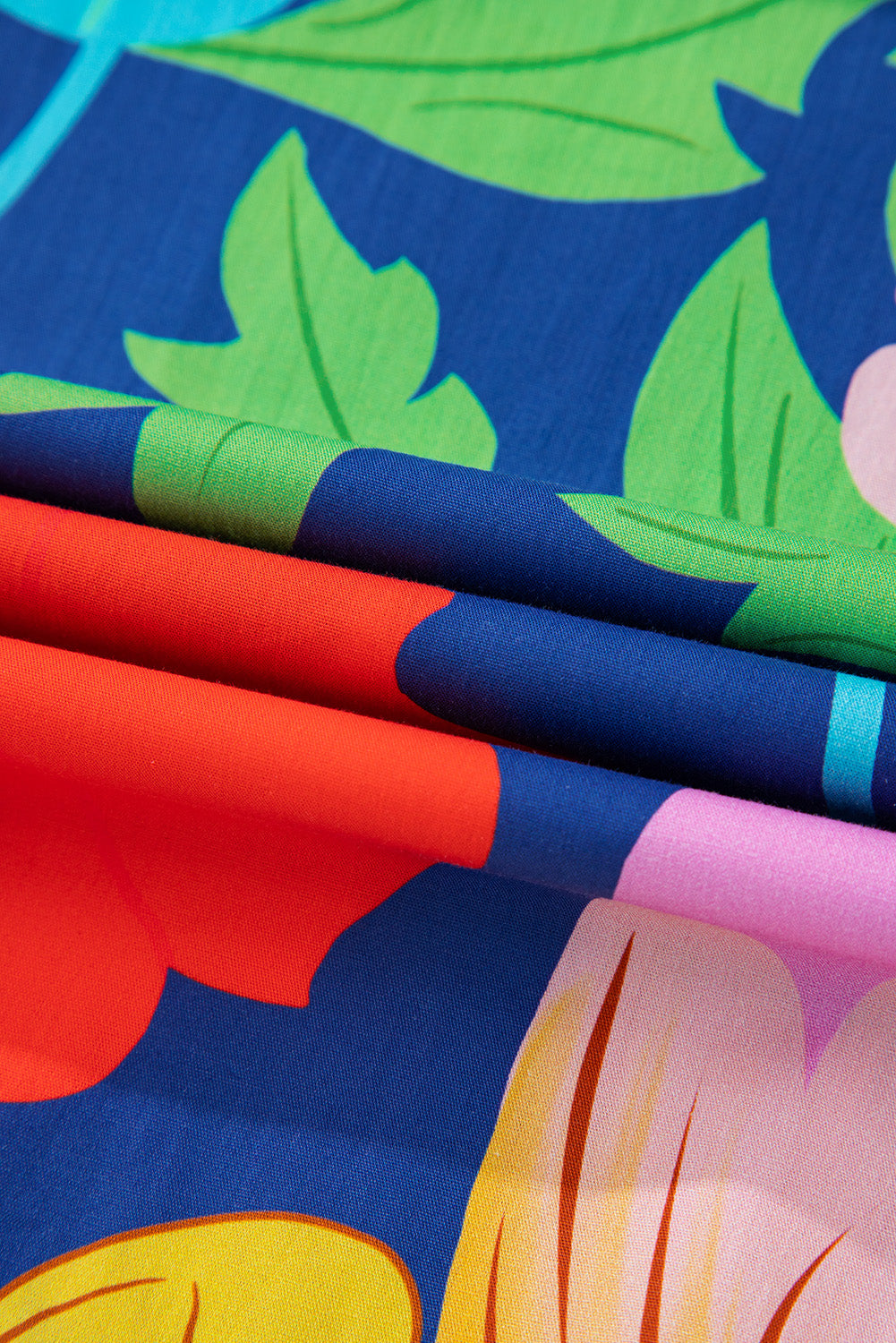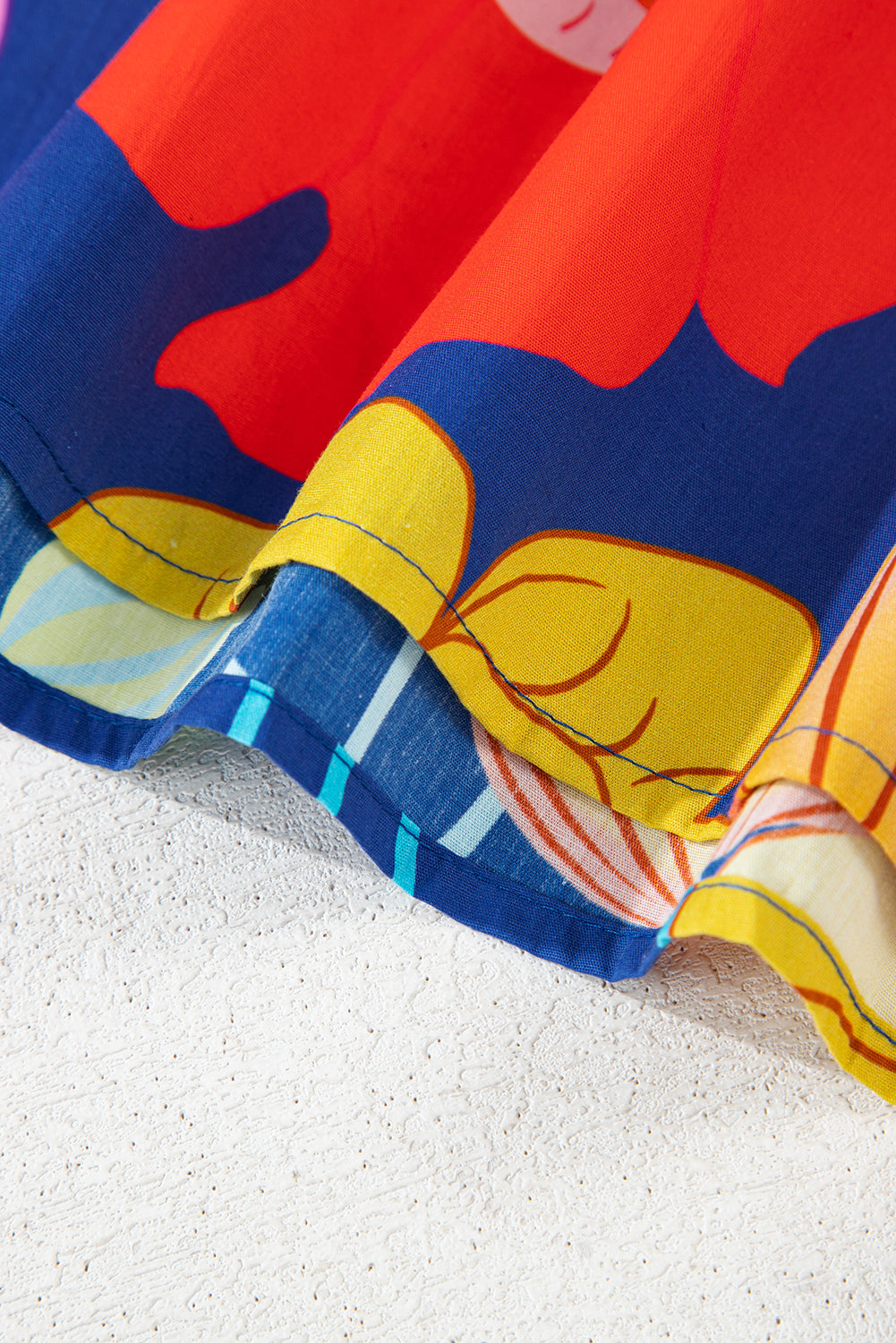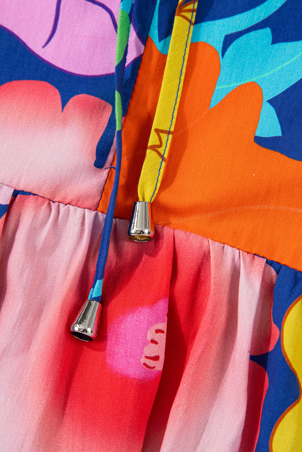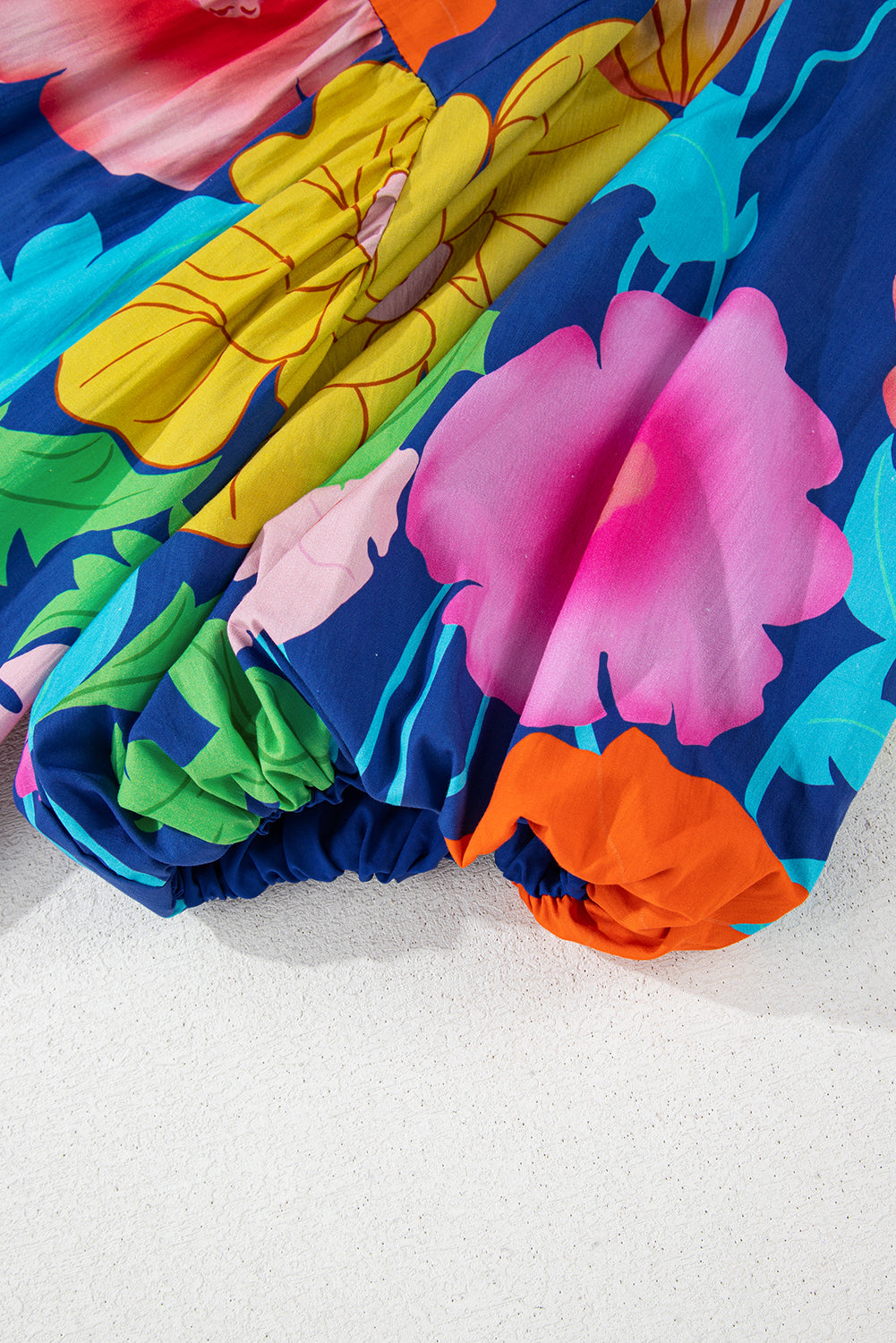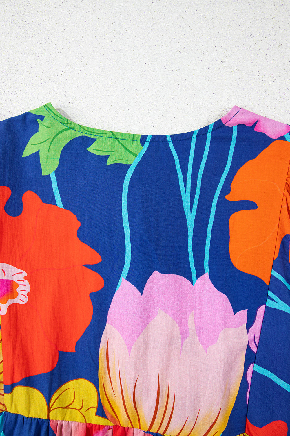 Dark Blue Floral Print Split Neck Babydoll Dress