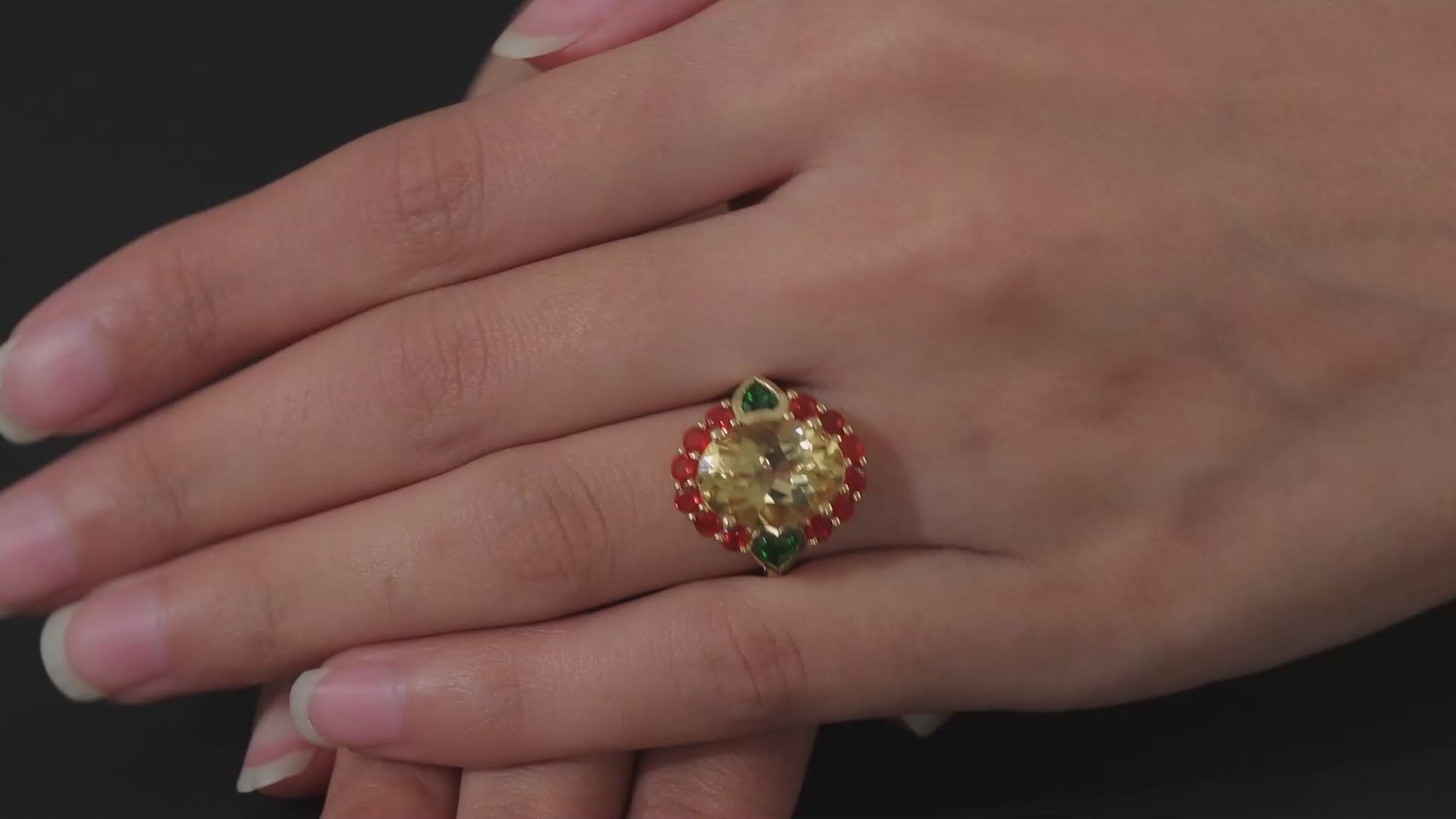 Elevate your style with this stunning fashion ring, featuring a radiant 4.98 ct. yellow labradorite as the centerpiece, accented by deep green chrome diopside and vibrant fire opals. Set in sterling silver with a rich yellow gold vermeil plating, this ring offers a luxurious and eye-catching design that’s perfect for making a statement.